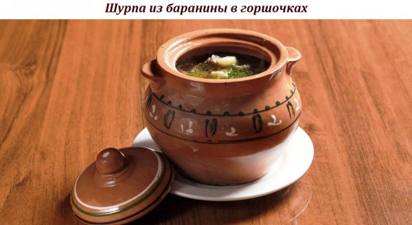 Описание: Шурпа из баранины в горшочкахСуп / Восточная кухняЛюбите классическую шурпу? Тогда попробуйте приготовить её вариацию в духовке. Получится наваристо и очень вкусно.• Баранина - 500 г• Картошка - 4 штуки• Репа - 2 штуки• Морковь - 2 штуки• Курдючный жир - 30 г• Репчатый лук - 2 штуки• Чеснок - 6–8 зубчиков• Соль - по вкусу• Перец чёрный горошком - по вкусу• Зира молотая - по вкусу• Кориандр молотый - по вкусу• Вода - 1 л1 - Нарежьте мясо, картошку, репу и морковь крупными или средними кусочками, курдючный жир — небольшими, лук — половинками колец, чеснок — половинками или четвертинками.*** Для супа лучше взять баранину на кости.2 - В каждый горшочек положите курдючный жир и мясо. Добавьте подготовленные овощи, соль, перец, зиру и кориандр.*** Рецепт рассчитан на 4 горшочка.3 - Залейте всё водой комнатной температуры, чтобы она немного не доходила до