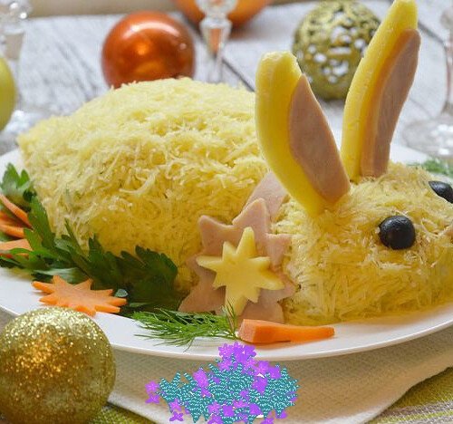 Описание: Салат "Кролик" с ветчиной, рисом, кукурузой и огурцомИнгредиенты :Ветчина - 200 гРис - 160 гКукуруза консервированная - 150 гЯйца - 4 шт.Лук репчатый - 60 гОгурец - 30 гУкроп свежий - 1 пучок (15 г)Майонез - 80 гСоль - 1/2 ч. ложкиПерец чёрный молотый - 1 щепотка*Для украшения :Сыр твёрдый - 300 гВетчина - 60 гМаслины без косточек - 1 шт.Зелень свежая - несколько веточекМорковь - несколько ломтиковПРИГОТОВЛЕНИЕ :Рис промыть до прозрачной воды, 4-5 раз. Выложить рис в кастрюлю и залить водой из расчёта 1:2 (на одну часть риса две части воды). Отправить кастрюлю на плиту.Довести до кипения. После закипания уменьшить огонь до минимума, посолить и варить рис до готовности - до впитывания жидкости, около 15 минут. Готовому рису дать немного остыть.Яйца отварить вкрутую в течение 10 минут после закипания. Остудить в холодной воде.Варёные яйца очистить от скорлупы и натереть на крупной тёркеВетчину нарезать некрупными кубиками.Лук очистить и нарезать мелкими кубиками.Огурец нарезать мелкими кубиками.Яйца, ветчину, огурец и лук отправить в глубокую посуду.Подготовить консервированную кукурузу без жидкости.Мелко нарезать свежий укроп.В салатник к подготовленным ингредиентам добавить рис, укроп и кукурузу.Заправить салат майонезом. При желании его количество можно увеличить.Салат поперчить. По желанию можно посолить, но не забывайте, что ветчина и рис уже солёные. Салат перемешать.Выложить салат на плоское блюдо, формируя туловище и голову кролика.Сыр натереть на мелкой тёрке. Оставить несколько ломтиков сыра Из них вырезать ушки кролика и другие элементы декора, например звёздочки.Объёмную фигурку кролика аккуратно покрыть натёртым сыром.Если сыр не удаётся прикрепить, можно смазать салат сверху слоем майонеза. Я дополнительно майонез не использовала.Из ветчины также вырезать элементы для украшения салата. Из ломтика ветчины вырезать ушки. По размеру они должны быть чуть меньше, чем сырные. Из ветчины вырезать также две полоски - шириной 1 см и длиной 8-9 см (в зависимости от размера шеи кролика). Также вырезать звёздочку.Соединить сырные и ветчинные ушки. Прикрепить зубочистки к основанию ушек (по центру). Если ушки не держатся, то используйте ещё 2 зубочистки. Также вырезать из ветчины небольшой треугольник. Это будет носик кролика.Выложить две полоски ветчины на шею кролика, соединить их в центре. Прикрепить с одной стороны полоски звёздочку. Установить ушки.Разрезать маслину пополам и прикрепить глазки к голове кролика. Из треугольника ветчины сделать носик. Выложить зелень вокруг кролика. Я также сделала декор из моркови.Салат "Кролик" с ветчиной, рисом, кукурузой и огурцом готов.Приятного аппетита!