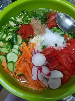 Описание: Летний салатик "Ассорти"Редиска гр 500-600 редисаОгурцы 1-2 шт Стручковый перец 3-4 штПомидоры черри 10 штМорковь половинка Пучок укропа, кинзы, лука-порей, Молотый чеснок 1ст.л, молотой кинзы 1ст.л, уксус 1 ст.л, соль 1.5 ст.л, сахар 3-4 ст.л, вода 1.5 литра
