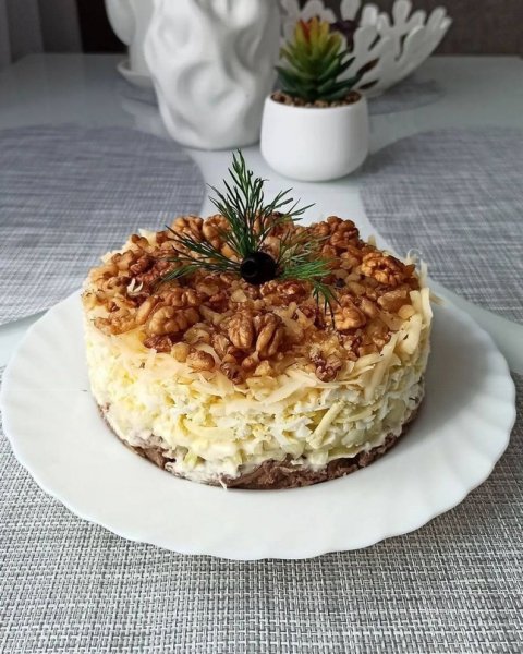 Описание: Салат Мясной капризговядина отварная- 300 гр;маринованный лук- 2 шт;яйцо- 4 шт;сыр- 150 гр;грецкие орехи- 70 гр;домашний майонез- 120 гр.1. Говядину отварить с добавлением соли и черного перца.2. Лук нарезать тонкими перьями, добавить к нему щепотку соли и сахара, 2ч.л.уксуса и залить кипячёной водой. Слить воду через 30 мин.3. Яйцо и сыр натереть на крупной тёрке.4. Собрать салат слоями чередуя сеточкой майонеза , верх украсить грецкими орехами! Слой яиц присыпать солью.