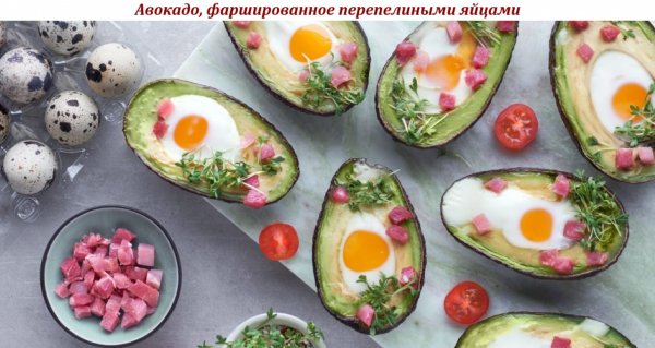 Описание: ♦ Авокадо, фаршированное перепелиными яйцами ♦Если надоела простая яичница, попробуйте запечь яйца в мягких лодочках из авокадо.Ингредиенты (на 4 порции):✔ Авокадо - 2 штуки✔ Перепелиные яйца - 4 штуки✔ Соль - по вкусу✔ Ветчина или мясные копчёности - по вкусу✔ Зелень - несколько веточекПриготовление (20 мин.):➦ Авокадо разрежьте на половинки и уберите косточку. Столовой ложкой удалите немного мякоти, чтобы получились отверстия под яйца.✦ Неиспользованную мякоть авокадо можно добавить в соусы или смузи.➦ Выложите лодочки из авокадо на противень или в форму срезом вверх. В каждую вбейте яйцо, слегка посолите.✦ Чтобы авокадо не заваливалось, можно сделать небольшие подпорки из фольги.➦ Отправьте в разогретую до 200 °С духовку примерно на 12–15 минут.➦ Ветчину или копчёности нарежьте мелкими кубиками.➦ Достаньте авокадо из духовки, добавьте копчёности и зелень.
