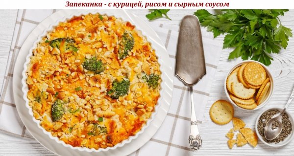 Описание: ___Запеканка - с курицей, рисом и сырным соусом___Сливочно-молочный соус объединит ингредиенты в единое целое, а крекеры добавят выразительный хруст.Ингредиенты:➦ Рис - 200 г➦ Соль - по вкусу➦ Брокколи - 250–300 г➦ Куриное филе - 500–600 г➦ Репчатый лук - 1 штука➦ Чеснок - 3 зубчика➦ Чеддер или другой сыр - 150–170 г➦ Солёные крекеры - 8–10 шт➦ Сливочное масло - 8 ст. ложек➦ Растительное масло - 1 ст. ложка + для смазывания➦ Мука - 4 ст. ложки➦ Сушёный тимьян - ½ ч. ложки➦ Сушёный майоран - ½ ч. ложки➦ Сушёный молотый лук - ½ ч. ложки➦ Хлопья красного перца - ⅓ ч. ложки➦ Молоко - 500 мл➦ Куриный бульон - 450 млПриготовление (1 ч. 15 мин.):➤ Рис отварите до готовности в слегка подсоленной воде.➤ Брокколи отварите за 3–4 минуты. Откиньте на дуршлаг и ополосните холодной водой. Оставьте, чтобы стекла жидкость. Крупные соцветия разделите на несколько частей.➤ Курицу нарежьте средними кусочками. Лук измельчите. Чеснок пропустите через пресс. Сыр натрите на крупной тёрке. Крекеры раскрошите.➤ В сковороде разогрейте по ложке сливочного и растительного масла.✦ В одной столовой ложке примерно 14–15 г сливочного масла.➤ Партиями слегка подрумяньте кусочки филе со всех сторон и выложите на тарелку.➤ В той же сковороде обжарьте лук до мягкости и лёгкой румяности. Закиньте чеснок и помешивайте ещё полминуты. Выложите к курице.➤ В сотейнике растопите 4 столовые ложки сливочного масла на среднем огне. Всыпьте муку и помешивайте 2–3 минуты.➤ Добавьте тимьян, майоран, луковый порошок и хлопья красного перца. Размешайте.➤ Партиями вливайте по очереди подогретые молоко и бульон, каждый раз перемешивая.➤ Помешивайте ещё несколько минут. Когда соус станет однородным, сделайте слабый и вмешайте ¾ сыра.➤ Снимите соус с огня. Добавьте рис, курицу, брокколи и немного соли. Перемешайте.➤ Выложите всё в смазанную растительным маслом форму.➤ Растопите 3 столовые ложки сливочного масла. Смешайте с крекерами и выложите в форму. Посыпьте оставшимся сыром.➤ Отправьте в разогретую до 180 °С на 20–25 минут.