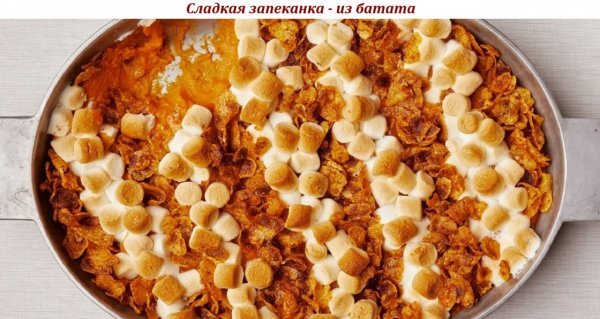 Описание: ___Сладкая запеканка - из батата___Попробуйте сделать необычное блюдо из сладкого картофеля - с добавлением кукурузных хлопьев и маршмеллоу.Ингредиенты:➦ Батат - 2 кг➦ Сахар - 180 г➦ Сливочное масло - 140 г➦ Молоко - 60 мл➦ Яйца - 2 штуки➦ Ванильный экстракт - 1 ч. ложка➦ Соль - ¼ ч. ложки➦ Кукурузные хлопья - 30–40 г➦ Коричневый сахар - 1 ст. ложка➦ Маршмеллоу - по вкусуПриготовление (2 ч.):➤ Целый батат запеките в духовке примерно за 1 час при температуре 200 °С. Остудите.➤ Очистите сладкий картофель и выложите мякоть в миску.➤ Добавьте сахар, размягчённое масло, молоко, яйца, ванильный экстракт и соль. Взбейте всё миксером.✦ Отложите заранее 1–2 столовые ложки масла.➤ Смажьте форму маслом и выложите в неё пюре из батата.➤ Растопите оставшееся масло. Смешайте с кукурузными хлопьями и коричневым сахаром. Полосами выложите на батат, оставляя место под маршмеллоу.✦ Хлопья можно оставить целыми или измельчить.➤ Отправьте в разогретую до 180 °С духовку на полчаса. Добавьте маршмеллоу и запекайте ещё 10 минут.
