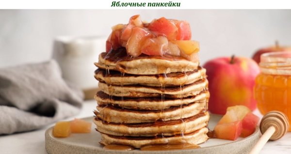 Описание: ___Яблочные панкейки___Добавьте в тесто тёртый фрукт для сочности и ароматную корицу для потрясающего аромата.Ингредиенты:➦ Мука пшеничная - 250 г➦ Соль - ½ ч. ложки➦ Коричневый или обычный сахар - 60 г➦ Разрыхлитель - 4 ч. ложки➦ Корица молотая - 1 ч. ложка➦ Яйца - 2 штуки➦ Молоко - 500 мл➦ Растительное масло - 120 мл + для смазывания➦ Кисло-сладкое яблоко - 1 штукаПриготовление (40 мин.):➤ В одной миске соедините просеянную муку с солью, сахаром, разрыхлителем и корицей.➤ В другой ёмкости взбейте яйца с молоком и маслом.➤ Перемешайте сухие и влажные ингредиенты.➤ Яблоко очистите от кожицы и удалите сердцевину. На крупной тёрке натрите фрукт прямо в тесто и перемешайте.➤ Сковороду смажьте маслом и разогрейте на среднем огне.➤ Обжаривайте панкейки примерно 3–4 минуты с одной стороны и 2–3 минуты с другой.