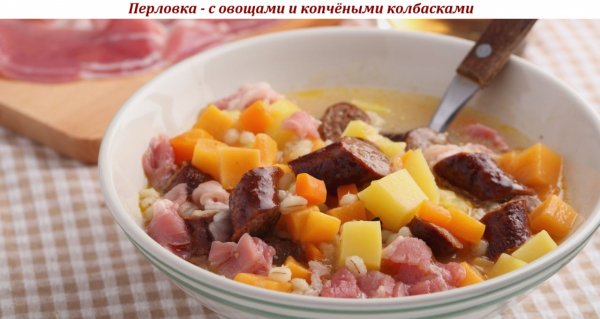 Описание: ___Перловка - с овощами и копчёными колбасками___Простое сытное блюдо с ярким ароматом копчёностей.Ингредиенты:➦ Перловка - 60–70 г➦ Копчёные колбаски - 4–5 штук➦ Картофель - 650 г➦ Морковь - 2 штуки➦ Копчёный бекон - 100–150 г➦ Репчатый лук - 1–2 штуки➦ Чеснок - 2 зубчика➦ Соль - по вкусу➦ Перец чёрный молотый - по вкусу➦ Мясной или овощной бульон - 350–400 млМожно добавить:➦ Тыква - 350–400 гПриготовление (8 ч. 35 мин.):➤ Замочите перловку на 4–5 часов или всю ночь. Ополосните под проточной водой.➤ Нарежьте колбаски, картофель, морковь и тыкву небольшими кусочками, бекон и лук — мельче.➤ Разогрейте сковороду на среднем огне. За несколько минут обжарьте бекон, чтобы из него вытопился жир.➤ Выложите бекон на тарелку. В той же сковороде обжарьте лук до мягкости и лёгкой румяности. Закиньте колбаски и подрумяньте за несколько минут.✦ Добавьте немного масла, если понадобится.➤ В толстостенную посуду для духовки выложите лук, чеснок, бекон и колбаски. Добавьте перловку, а поверх неё — остальные овощи. Слегка посолите, поперчите и залейте тёплым бульоном.➤ Накройте крышкой и отправьте в разогретую до 140 °С духовку примерно на 3 часа.