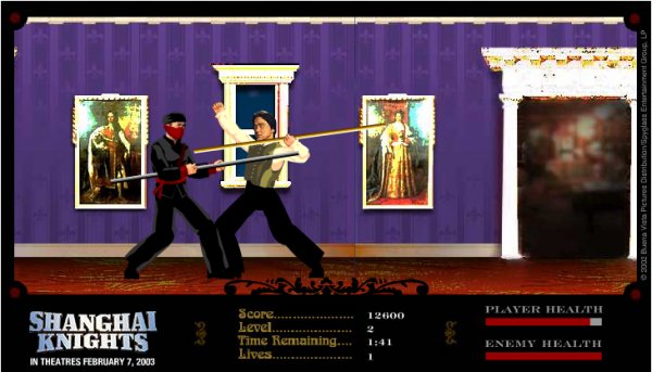 Описание: Для рекламы нового фильма «Шанхайские рыцари», который в то время выходил на экраны, Warner Bros. выпустила бесплатную флэш-игру под названием Jackie Chan's Shanghai Showdown.Игра представляет собой юмористический ремейк Kung Fu и проводит вас через 4 этажа, сражаясь с ниндзя и рыцарями в доспехах. В вашем распоряжении высокий удар ногой, удар рукой и удар ногой в полёте, и большинство врагов убиваются одним ударом. Графика в основном использует картинки-клипы, что придает игре довольно забавный вид. Как только вы достигнете верхнего этажа, вы столкнетесь с Ву Йипом, персонажем Донни Йена из фильма.Прохождение всей игры займёт не более 5 минут, и маловероятно, что вы умрете хотя бы раз. Но поскольку это всего лишь простая рекламная игра для фильма, она довольно хорошо сделана и забавна, и эти 5 минут, вероятно, заставят вас посмеяться.