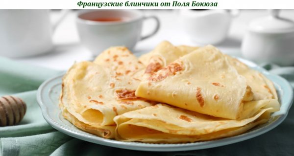 Описание: ___Французские блинчики от Поля Бокюза___По рецепту легендарного шеф-повара у вас получатся идеальные тонкие блины на молоке с добавлением сливочного масла.Ингредиенты:➦ Сливочное масло - 50 г + для смазывания➦ Мука пшеничная - 250 г➦ Соль - ⅛ ч. ложки➦ Сахар - 1 ст. ложка➦ Яйца - 3 штуки➦ Молоко - 500 млПриготовление(1 ч. 30 мин.):➤ В маленькой кастрюле растопите сливочное масло на небольшом огне.➤ Просеянную муку соедините с солью и сахаром. Сделайте углубление, влейте яйца и начините аккуратно перемешивать венчиком по направлению от краёв к центру.➤ Продолжая перемешивать влейте сначала молоко, а после — остывшее масло. Тщательно размешайте, чтобы не осталось комков.➤ Накройте миску с блинным тестом плёнкой и оставьте на 1 час при комнатной температуре.➤ Разогрейте сковороду на среднем огне и слегка смажьте маслом. Небольшими порциями выливайте на сковороду тесто и подрумянивайте блинчики с обеих сторон.