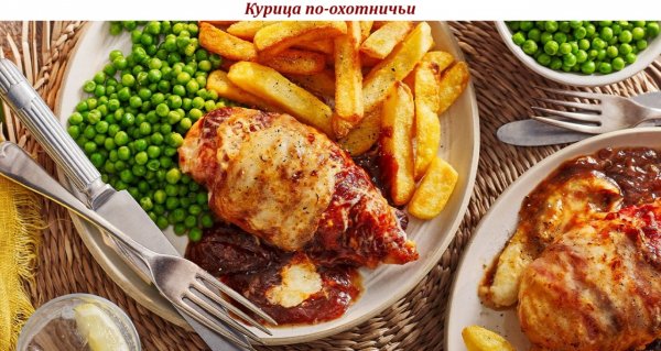 Описание: ___Курица по-охотничьи___Классика британских пабов... Филе запекается в беконе под сырной корочкой и с домашним соусом барбекю. Ингредиенты (на 4 порции):➦ Филе куриной грудки - 4 штуки➦ Соль - по вкусу➦ Перец чёрный молотый - по вкусу➦ Копчёный бекон - 8 ломтиков➦ Кетчуп - 5 ст. ложек➦ Мёд - 3 ст. ложки➦ Коричневый сахар - 2 ст. ложки➦ Яблочный уксус - 1 ст. ложка➦ Молотая горчица - 2 ч. ложки➦ Вода - 3 ст. ложки➦ Чеддер или другой сыр - 100 гПриготовление (40 мин.):➤ Каждое филе посолите, поперчите и оберните беконом.➤ Выложите курицу в форму для запекания и отправьте в разогретую до 200 °С духовку примерно на 25 минут.➤ В небольшой кастрюле смешайте кетчуп, мёд, сахар, уксус, горчицу и воду. Доведите до кипения и варите на среднем огне до лёгкого загустения примерно 5–10 минут.➤ Полейте курицу получившимся соусом, посыпьте крупно натёртым сыром и запекайте ещё 5 минут.✦ При подаче на стол добавьте к курице картофель фри и зелёный горошек.