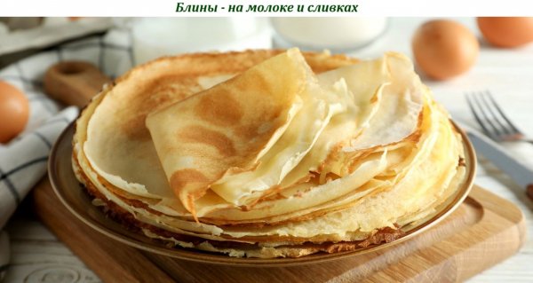 Описание: ___Блины - на молоке и сливках___Блинчики получаются тонкими и нежными.Ингредиенты:➦ Яйца - 3 штуки➦ Сахар - 2 ст. ложки➦ Соль - ¼ ч. ложки➦ Молоко - 350 мл➦ Мука - 200 г➦ Сливки 20%-ной жирности - 300 мл➦ Растительное масло - 2 ст. ложки + для смазыванияПриготовление (1 ч.):➤ Венчиком взбейте яйца с сахаром и солью. Введите молоко.➤ Частями подсыпайте муку, тщательно перемешивая.➤ Влейте сливки и масло, снова взбейте тесто. Уберите в холодильник на полчаса.➤ Обжарьте блины до золотистого цвета с двух сторон.