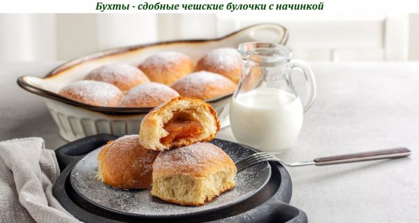 Описание: ___Бухты - сдобные чешские булочки с начинкой___Бухты делают из дрожжевого теста, а в качестве начинки используют джем, творог, шоколад или мак.Ингредиенты (на 10 порций):➦ Молоко - 180 мл➦ Сахар - 65 г➦ Сухие дрожжи - 1½ ч. ложки➦ Сливочное масло - 100 г + 2 ст. ложки➦ Мука - 380 г➦ Соль - ¼ ч. ложки➦ Яйцо - 1 штука➦ Джем - 350 г➦ Ром - 2 ст. ложки➦ Сахарная пудра - 2 ст. ложкиПриготовление (3 ч.):➤ Подогрейте молоко, но не делайте его слишком горячим.➤ Смешайте 120 мл молока, 1 чайную ложку сахара и дрожжи. Оставьте в тёплом месте на 10–15 минут — на поверхности должны появиться пузырьки.➤ Растопите 60 г масла и остудите.➤ В большой миске соедините муку, оставшийся сахар, остальное молоко, масло, соль и яйцо.➤ Влейте дрожжевую массу и перемешайте вилкой. Затем месите тесто руками около 10 минут.✦ Если тесто липкое, подсыпайте немного муки.➤ Накройте полотенцем или плёнкой и оставьте в тёплом месте без сквозняков на 1 час.➤ Разделите тесто на 9–10 одинаковых кусочков. Раскатайте каждый, положите в центр начинку, подверните края и покатайте шарик в ладонях.➤ Растопите 40 г сливочного масла и остудите. Смажьте им форму размером примерно 33 × 23 см.➤ Выложите булочки в форму швом вниз. Тесто тоже смазывайте маслом.➤ Оставьте в тёплом месте на 20 минут, чтобы тесто ещё немного поднялось.➤ Отправьте в духовку, разогретую до 180 °C, примерно на 35 минут.➤ Растопите 2 столовые ложки сливочного масла, остудите и смешайте с ромом. Смажьте смесью горячие булочки. Перед подачей посыпьте сахарной пудрой.