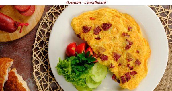 Описание: ___Омлет - с колбасой___Приготовьте простой и быстрый омлет с колбасой на сковороде на завтрак или ужин.Ингредиенты (на 2 порции):➦ Яйца - 4 штуки➦ Соль - по вкусу➦ Молоко - 50 мл➦ Колбаса - 50 г➦ Растительное масло - 1–2 ч. ложкиПриготовление (10 мин.):➤ Вилкой или венчиком взбейте яйца с солью и молоком.➤ Колбасу нарежьте небольшими кусочками.✦ Количество колбасы регулируйте на свой вкус.➤ Разогрейте масло в сковороде на умеренном огне. Подрумяньте колбасу.➤ Залейте её яичной смесью. Сделайте слабый огонь, накройте крышкой и готовьте 5–7 минут, пока яйца не схватятся.