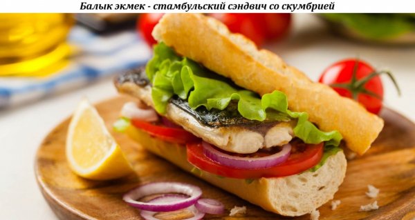 Описание: ***Балык экмек - стамбульский сэндвич со скумбрией***Одна из вариаций на тему популярного турецкого фастфуда.Ингредиенты (на 2 порции):➦ Репчатый лук - по вкусу➦ Помидор - 1 штука➦ Оливковое масло - 2 ст. ложки + для обжаривания➦ Свежевыжатый лимонный сок - 2 ст. ложки + для рыбы➦ Гранатовая патока или соус - 1 ст. ложка➦ Сумах - ¼ ч. ложки➦ Соль - ¼ ч. ложки + для рыбы➦ Перец чёрный молотый - ¼ ч. ложки➦ Хлопья красного перца - 1 щепотка➦ Филе скумбрии - 2 штуки➦ Багет - 1 штука➦ Листовой салат - по вкусуПриготовление (30 мин.):➤ Лук нарежьте кольцами, помидор — кружочками.✦ Вам понадобится всего несколько колец лука.➤ Оливковое масло смешайте с лимонным соком, гранатовой патокой, сумахом, солью и перцами.➤ Филе скумбрии посолите и смажьте каждое соусом.✦ Смазывать сторону с кожей не нужно.➤ В сковороде разогрейте масло на среднем огне и обжаривайте филе примерно по 3 минуты с каждой стороны. Выложите на бумажные полотенца.➤ Багет разрежьте поперёк пополам, а после каждую половину разрежьте вдоль ещё на 2 части.➤ Слегка подсушите багет без масла на обычной сковороде или сковороде-гриль.✦ Выкладывайте хлеб срезом вниз.➤ Возьмите четвертинку багета. Выложите на неё салатные листья, помидоры и луковые кольца.➤ Добавьте рыбное филе и полейте лимонным соком. Накройте салатными листьями и четвертинкой багета.➤ Таким же образом соберите второй сэндвич.