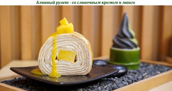 Описание: ***Блинный рулет - со сливочным кремом и манго***Попробуйте сделать из готовых блинов красивый сладкий рулет.Ингредиенты для рулета:➦ Манго - 2 шутки➦ Сливки 33%-ной жирности - 500 мл➦ Сахарная пудра - 70 г➦ Блины - 20–22 штукиИнгредиенты для соуса:➦ Манго - 3 штуки➦ Сахар - 3 ст. ложки➦ Вода - 60 млПриготовление (3 ч.):➤ Манго очистите от кожицы и нарежьте небольшими кусочками.➤ Холодные сливки взбейте с сахарной пудрой до появления устойчивых пиков.➤ Застелите стол фольгой или плёнкой. Возьмите четыре блина и положите внахлёст один на другой, чтобы получился квадрат. Смажьте кремом. С одного края выложите кусочки манго.➤ Начните скручивать рулет со стороны начинки и сделайте несколько оборотов, но не сворачивайте до конца.➤ Выложите ещё два блина внахлёст и добавьте крем. Вновь подкрутите рулет.➤ Таким образом соберите весь рулет. Заверните в фольгу или плёнку. Уберите в холодильник на 2–3 часа.➤ Для соуса нарежьте манго небольшими кусочками. Смешайте с сахаром и водой в небольшой кастрюле.➤ Доведите до кипения на среднем огне. А после варите на умеренном примерно 10 минут или немного дольше, чтобы масса загустела. Протрите соус через мелкое сито и остудите.➤ Готовый рулет подавайте с кусочками манго и соусом.