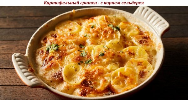 Описание: ***Картофельный гратен - с корнем сельдерея***Сочетание двух овощей сделает вкус классического гратена насыщеннее и интереснее.Ингредиенты:➦ Молоко - 150 мл➦ Сливки жирностью от 20% - 150 мл➦ Овощной бульон - 150 мл➦ Картофель - 1 кг➦ Корень сельдерея - 1 штука➦ Сливочное масло - 50 г➦ Соль - по вкусу➦ Перец чёрный молотый - по вкусу➦ Сыр - 80–100 гПриготовление (1 ч. 25 мин.):➤ В кастрюле нагрейте молоко вместе со сливками и бульоном.➤ Картофель и корень сельдерея нарежьте тонкими ломтиками.➤ В сковороде растопите масло на среднем огне. Выкладывая в один слой, обжаривайте кусочки сельдерея по полминуты с каждой стороны.➤ Форму для запекания смажьте маслом. Выложите в неё слоями картофель и сельдерей. Каждый слой слегка солите и перчите. Залейте молоком со сливками и бульоном.➤ Отправьте в разогретую до 180 °С духовку примерно на 1 час. За 10 минут до готовности уберите фольгу и посыпьте гратен тёртым сыром.