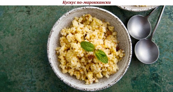 Описание: ***Кускус по-мароккански***Изюм и измельчённые орехи удачно сочетаются с крупой.Ингредиенты:➦ Репчатый лук - ½–1 штука➦ Чеснок - 2 зубчика➦ Орехи - 60–70 г➦ Изюм - 50–60 г➦ Растительное масло - 2 ст. ложки➦ Соль - ½ ч. ложки➦ Перец чёрный молотый - ¼ ч. ложки➦ Корица молотая - ¼ ч. ложки➦ Тмин молотый - ½ ч. ложки➦ Вода - 750 мл➦ Кускус - 220 гПриготовление (20 мин.):➤ Лук нарежьте мелкими кусочками. Чеснок пропустите через пресс. Орехи измельчите ножом. Изюм промойте тёплой водой и подсушите.✦ Используйте любые орехи по своему вкусу.➤ В кастрюле разогрейте масло на среднем огне. Обжарьте лук до мягкости и лёгкой румяности.➤ Закиньте чеснок вместе с солью, перцем, корицей и тмином.➤ Залейте горячим бульоном и доведите до кипения.➤ Всыпьте кускус, размешайте и снимите с огня. Оставьте под крышкой на 10 минут.➤ Добавьте к кускусу орехи вместе с изюмом, перемешайте.