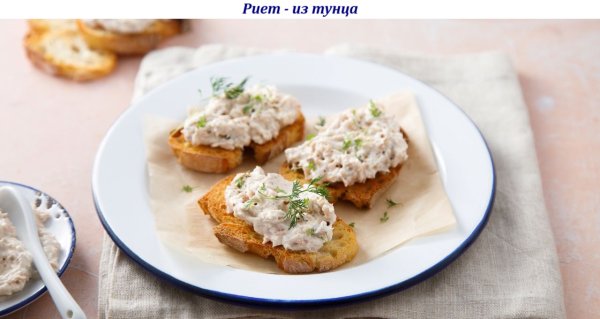 Описание: ***Риет - из тунца***В отличие от паштета, в этой закуске рыба не измельчается до однородной текстуры.Ингредиенты:➦ Консервированный тунец - 350 г➦ Лук-шалот - 1 штука➦ Свежевыжатый лимонный сок - 1 ст. ложка➦ Оливковое масло - 50 мл➦ Греческий йогурт или сметана - 80 г➦ Соль - по вкусу➦ Перец чёрный молотый - по вкусуМожно добавить:➦ Зелёный лук - по вкусу➦ Петрушка или укроп - по вкусуПриготовление (2 ч.):➤ Разомните рыбу вилкой так, чтобы кусочки получились не слишком мелкими.➤ Луковицу нарежьте маленькими кусочками. Измельчите зелень, если хотите добавить.✦ Достаточно добавить по 2 столовых ложки каждого вида зелени.➤ Добавьте к рыбе лук, зелень, лимонный сок, оливковое масло, йогурт, соль и перец. Размешайте.➤ Накройте миску с риетом крышкой или плёнкой и уберите в холодильник на полтора-два часа.