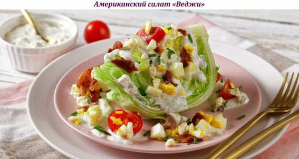 Описание: ***Американский салат «Веджи»***Основа блюда — салат Айсберг. Он подаётся с яйцами, беконом, черри и насыщенным соусом.Ингредиенты:➦ Яйца куриные - 4 штуки➦ Копчёный бекон - 8 ломтиков➦ Помидоры черри - 100–150 г➦ Зелёный лук - несколько стеблей➦ Майонез - 120 г➦ Сметана - 240 г➦ Пахта - 3 ст. ложки➦ Красный винный уксус - 3 ч. ложки➦ Вустерский соус - ½ ч. ложки➦ Чесночная соль - ¼ ч. ложки➦ Перец чёрный молотый - ½ ч. ложки➦ Сыр с голубой плесенью - 120–150 г➦ Салат Айсберг - 1 кочанПриготовление (30 мин.):➤ Яйца отварите вкрутую и остудите.➤ Бекон нарежьте небольшими кусочками. Подрумяньте на сковороде без масла и выложите на бумажные полотенца.➤ Яйца нарежьте небольшими кусочками, черри — половинками или мельче. Зелёный лук нарубите.➤ Майонез смешайте со сметаной, пахтой, уксусом, вустерским соусом, чесночной солью, перцем и раскрошенным сыром.➤ Удалите у Айсберга вялые листья. Разрежьте кочан на 4 части и разложите по тарелкам.➤ Каждую четвертинку салата полейте соусом. Добавьте яйца, бекон, черри и зелёный лук.