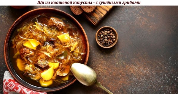 Описание: ***Щи из квашеной капусты - с сушёными грибами***Этот постный суп выйдет насыщенным и очень ароматным.Ингредиенты:➦ Сушёные лесные грибы - 25–30 г➦ Вода - 1 700–1 800 мл➦ Картофель - 3–4 штуки➦ Репчатый лук - 1 штука➦ Квашеная капуста - 300–350 г➦ Растительное масло - 2 ст. ложки➦ Лавровый лист - 1 штука➦ Соль - по вкусуПриготовление (4 ч.):➤ Грибы (если не сами насушили, а купили у кого-либо на рынке) промойте чтобы избавиться от песка и лесного мусора.➤ Сложите грибы в кастрюлю и добавьте 500 мл прохладной воды. Оставьте на несколько часов.➤ Отварите грибы примерно за полчаса.➤ Картофель нарежьте кусочками среднего размера, лук — мельче. Капусту отожмите и, если хотите, нарубите.➤ Лук обжарьте на растительном масле до лёгкой румяности.➤ Закиньте капусту и влейте 150–200 мл кипятка. Тушите на небольшом огне под крышкой примерно 20–25 минут.➤ В кастрюле вскипятите примерно 1 л воды. Закиньте картошку и варите 10 минут.➤ Добавьте грибы вместе с бульоном от варки, капусту с луком, лавровый лист и соль. Готовьте ещё 10 минут.➤ Снимите щи с огня и оставьте под крышкой настаиваться на 15–20 минут.