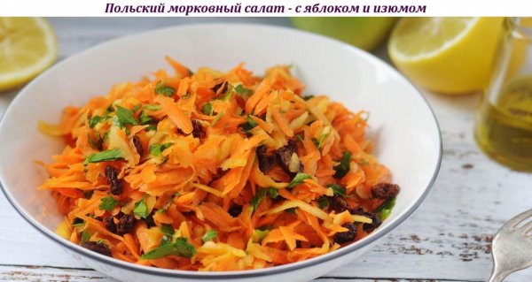 Описание: ***Польский морковный салат - с яблоком и изюмом***Салат выходит сочным и хрустящим, с нотками приятной сладости и кислоты.Ингредиенты:➦ Изюм - 70–80 г➦ Морковь - 3–4 штуки➦ Кисло-сладкое яблоко - 1 штука➦ Оливковое масло - 1 ст. ложка➦ Свежевыжатый лимонный сок - 1 ст. ложка➦ Соль - по вкусу➦ Сахар - по вкусу➦ Петрушка или другая зелень - несколько веточекПриготовление (1 ч. 45 мин.):➤ Изюм на 15 минут замочите в тёплой воде. Слейте всю жидкость, подсушите.➤ Морковь и очищенное яблоко натрите на крупной тёрке.➤ В миске смешайте подготовленные ингредиенты с маслом, лимонным соком, солью и сахаром.➤ Накройте плёнкой или крышкой и оставьте в холодильнике на час-полтора. Добавьте немного зелени при подаче.