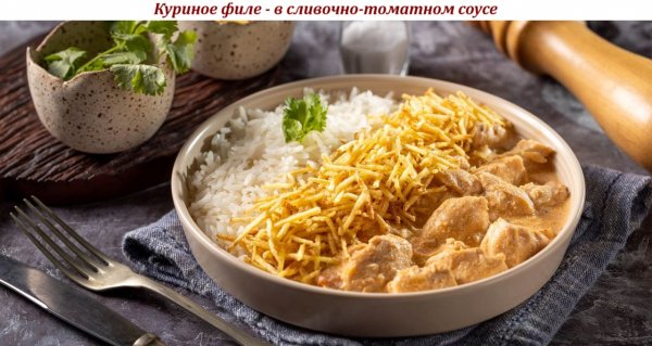 Описание: ***Куриное филе - в сливочно-томатном соусе***Кусочки птицы выходят мягкими и нежными, а соус станет отличным дополнением к гарнирам.Ингредиенты:➦ Куриное филе - 700–800 г➦ Репчатый лук - 1 штука➦ Чеснок - 2 зубчика➦ Растительное масло - 2 ст. ложки➦ Томатный соус - 1–2 ст. ложки➦ Горчица дижонская или другая - 1 ст. ложка➦ Соль - ⅔ ч. ложки➦ Перец чёрный молотый - по вкусу➦ Сливки 20%-ной жирности - 250–300 млПриготовление (30 мин.):➤ Нарежьте курицу небольшими кусочками, лук — более мелкими. Чеснок пропустите через пресс.➤ В сковороде разогрейте масло на среднем огне. Обжарьте лук до мягкости. Закиньте чеснок и помешивайте 30–60 секунд.➤ Добавьте в сковороду филе. Обжаривайте несколько минут, чтобы кусочки поменяли цвет со всех сторон.➤ Выложите в сковороду томатный соус вместе с горчицей, солью и перцем. Помешивайте 1–2 минуты.➤ Влейте в сковороду подогретые сливки и перемешайте. Оставьте на умеренном огне под крышкой ещё примерно на 7–10 минут.