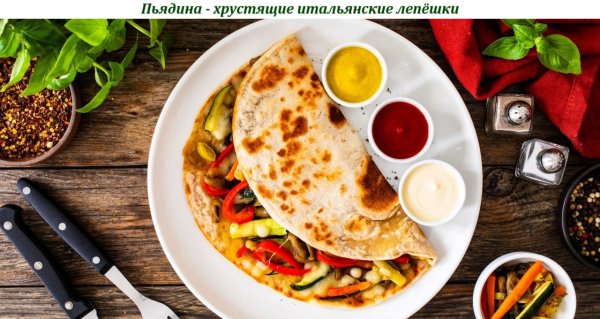 Описание: ***Пьядина - хрустящие итальянские лепёшки***В тесто добавляется смалец — свиной жир. Благодаря жиру, особой раскатке теста и долгому охлаждению лепёшки получаются хрустящими. В них можно заворачивать любые начинки, например, ветчину с сыром и руколой или жареные овощи с мясом.Ингредиенты (на 5 порций):➦ Мука - 440 г + для посыпки➦ Среднее яйцо - 1 штука➦ Молоко - 150 мл➦ Вода - 50 мл➦ Молотый чёрный перец - 1 г➦ Соль - 5 г➦ Смалец - 100 гПриготовление (3 ч.):➤ Смешайте муку, яйцо, молоко, воду, перец и соль. Замесите тесто.➤ Сформируйте шар, накройте плёнкой и оставьте на 1 час.➤ Разделите тесто на 5 одинаковых частей.➤ Присыпьте стол мукой и раскатайте одну часть теста в пласт диаметром 27 см.✦ Если тесто липкое, присыпайте его мукой.➤ Аккуратно смажьте свиным жиром. Скрутите в трубочку и осторожно растяните её. Затем сверните в улитку.➤ Так же поступите с остальными заготовками.➤ Накройте тесто плёнкой и уберите в холодильник минимум на 1 час. Их можно держать там вплоть до 2 суток.✦ Чем дольше тесто пролежит в холодильнике, тем более хрустящими будут лепёшки.➤ Посыпьте стол и улитки мукой. Раскатайте каждую в лепёшку диаметром около 26 см и толщиной 3 мм.➤ Разогрейте на среднем огне сковороду с антипригарным дном.➤ Положите туда лепёшку. Примерно через 2 минуты, когда на поверхности начнут появляться пузырьки, а снизу тесто подрумянится, переверните лепёшку. Поджаривайте ещё примерно столько же.✦ Убавьте огонь, если лепёшка подгорает слишком быстро.➤ Приготовьте остальные лепёшки. Готовые накрывайте полотенцем, чтобы они оставались тёплыми.