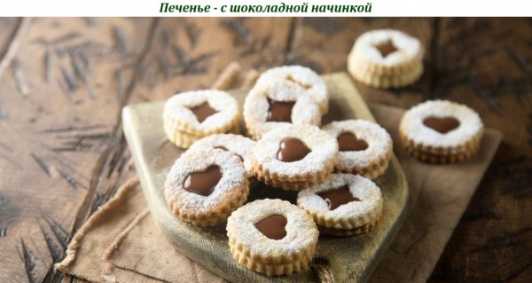 Описание: ***Печенье - с шоколадной начинкой***Приготовить вкусное и красивое печенье очень просто.Ингредиенты:➦ Сливочное масло - 230 г➦ Мука - 430 г➦ Крупные яйца - 2 штуки➦ Сахар - 200 г➦ Сода - 1 ч. ложка➦ Яблочный уксус - 2 ч. ложки➦ Мёд - 2 ст. ложки➦ Шоколадная паста - 250 г➦ Сахарная пудра - по вкусуПриготовление (50 мин.):➤ Нарежьте охлаждённое масло небольшими кусочками. Добавьте к муке и разотрите руками, чтобы получились крошки.➤ Миксером на высокой скорости взбейте яйца с сахаром. Влейте к муке с маслом и перемешайте.➤ Соду залейте уксусом и добавьте к остальным ингредиентам вместе с мёдом. Замесите тесто.➤ Заверните тесто в пакет и оставьте при комнатной температуре на полчаса.➤ Разделите тесто на 4 части. Возьмите одну и раскатайте в пласт толщиной несколько миллиметров.✦ Тесто, которое не используете, держите в пакете.➤ С помощью высечек или стакана вырежьте заготовки под печенье. У половины в центре сделайте небольшое отверстие ножом или высечкой.➤ Таким же образом сделайте заготовки из всего теста.➤ Выложите печенье на застеленный пергаментом противень и отправьте в разогретую до 170 °С духовку примерно на 5–6 минут.➤ Готовое печенье остудите. Половинки без отверстия смажьте шоколадной пастой, а оставшиеся посыпьте сахарной пудрой. Соедините половинки печенья.