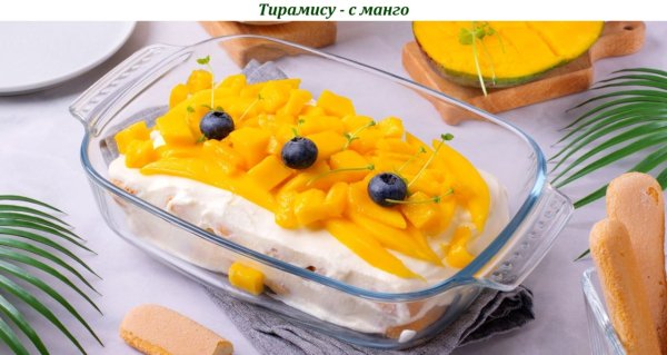 Описание: ***Тирамису - с манго***Простой нежный десерт без выпечки. Пышный крем из маскарпоне и сливок, воздушное печенье, пропитанное фруктовым соком, и сочные экзотические фрукты — перед таким сложно устоять.Ингредиенты:___Маскарпоне - 250 г___Сахарная пудра - 60 г___Ванильный экстракт - 1 ч. ложка___Сливки 33%-ной жирности - 240 мл___Манго - 2 штуки___Печенье савоярди* - примерно 16 штук___Сок манго - 120 мл* Савоя́рди (итал. savoiardi — «савойские»), также «дамские пальчики» — бисквитное печенье вытянутой плоской формы, сверху покрытое крупинками сахара. Савоярди легко впитывают жидкость и становятся от этого очень мягкими. Савоярди — неотъемлемый ингредиент многих французских и итальянских десертов, в частности, это печенье используется в приготовлении тортов-мороженых, русской шарлотки и тирамису.Савоярди были придуманы при дворе герцогов Савойских в конце XV века по случаю визита короля Франции и вскоре получили статус «официального» печенья Савойи.Приготовление (3 ч.):1․ Миксером взбейте маскарпоне с сахарной пудрой и ванилью.2․ Влейте холодные сливки и снова взбейте до пышности.3․ Очистите манго и нарежьте слайсами (тонкими ломтиками) или кубиками.4․ Савоярди окуните в сок и выложите половину в форму. Покройте половиной крема и половиной манго.5․ Повторите слои. Накройте форму и уберите тирамису с манго в холодильник на 2–3 часа.