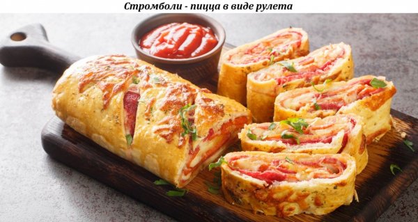 Описание: Форма — главное отличие этой дрожжевой выпечки от пиццы. В начинку идут сыр и мясо, а томатный соус обычно подаётся отдельно.Ингредиенты (на 2 порции):__ Вода - 320 мл__ Сахар - 1 ст. ложка__ Дрожжи сухие быстродействующие - 2¼ ч. ложки__ Оливковое масло - 30 мл__ Соль - 1 ч. ложка__ Мука пшеничная - 450 г__ Моцарелла или другой сыр - 450 г__ Салями или чоризо - 200 г__ Ветчина - 250 г__ Петрушка - несколько веточек__ Чеснок - 2 зубчика__ Сливочное масло - 45 г__ Яйцо - 1 штукаПриготовление (2 ч. 30 мин.)1․ Тёплую воду смешайте с сахаром и дрожжами. Оставьте на 5 минут.2․ Добавьте оливковое масло вместе с солью, а после засыпьте муку. Замесите мягкое тесто.3․ Смажьте миску маслом. Выложите в неё тесто и переверните, чтобы покрыть его маслом со всех сторон. Накройте салфеткой или плёнкой и оставьте на час-полтора в тёплом месте без сквозняков.✦ Используйте большую миску, так как тесто должно увеличиться в объёме примерно в два раза.4․ Моцареллу и мясо нарежьте тонкими ломтиками. Мелко порубите петрушку. Чеснок пропустите через пресс.✦ В начинке можно комбинировать разные виды колбасы и ветчины.5․ Масло растопите в микроволновке или на водяной бане. Слегка остудите и смешайте с чесноком.6․ Венчиком или вилкой взбейте яйцо с 1 столовой ложкой воды.7․ Обомните тесто и разделите пополам.8․ Возьмите один кусок теста и раскатайте в пласт размером примерно 25 × 40 см.✦ Рабочую поверхность, руки и скалку слегка присыпайте мукой при работе с тестом.9․ Смажьте всю поверхность теста чесночным маслом. Посыпьте петрушкой, выложите половину колбасы и сыра. Повторите слои мяса и сыра.✦ С одной из широких сторон отступите 6–7 сантиметров, а с остальных достаточно отступить по 2–2½ см.10․ Свободные от начинки края смажьте яйцами. Скрутите плотный рулет, двигаясь по направлению к стороне с большим отступом. Защипните край.✦ Слегка подгибайте края к центру, чтобы вся начинка была внутри.11․ Выложите стромболи на противень, застеленный пергаментом и смазанный маслом. Смажьте яйцом и сделайте несколько небольших надрезов сверху.✦ Можно слегка посыпать заготовку тёртым сыром.12․ Таким же образом соберите второй рулет.13․ Запекайте примерно 25 минут при температуре 200 °С.