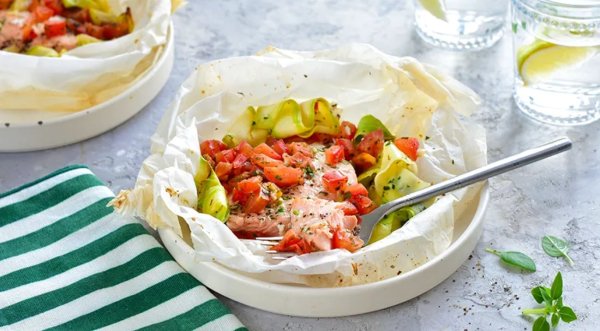Нерка в пергаменте, с кабачками, помидорами и зеленью