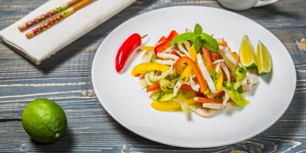 Описание: ✅ Тайский салат - с кальмарами и перцемОцените сочетание нежных морепродуктов с сочными овощами и кисло-сладкой заправкой.Для приготовления 3 порций нужно... ✦ Очищенные тушки кальмаров - 250 г✦ Сладкий перец - 1 штука✦ Фиолетовая или белая луковица - 60 г✦ Сельдерей - ½ стебля✦ Свежий огурец - 1 штука✦ Зелёный лук - 1 стебель✦ Кинза - 10 г✦ Чили или другой острый перец - 2 штуки✦ Чеснок - 3 зубчика✦ Сахар - 1 ст. ложка✦ Свежевыжатый лаймовый сок - 1 ст. ложка✦ Рыбный соус - 2 ст. ложкиГотовка: 15 мин.1․ - Кальмаров отварите меньше, чем за 1 минуту. Остудите и нарежьте кольцами или соломкой.2․ - Сладкий перец нарежьте соломкой, лук — тонкими кольцами или половинками колец, сельдерей и очищенный огурец — не слишком крупными кусочками.❗ Кстати... Используйте части перцев разного цвета, чтобы блюдо вышло ярче.3․ - Мелко нарубите зелень. Добавьте к остальным ингредиентам и перемешайте.❗ Кстати... Достаточно 1 столовой ложки кинзы.4․ - Чили очистите от семян, вместе с чесноком нарежьте кусочками и разотрите в ступке. Смешайте с сахаром, соком лайма и рыбным соусом. Заправьте салат.© Из Сети