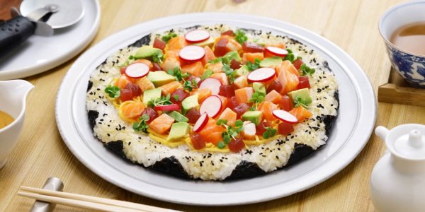 Описание: ✅ Суши-пицца - два любимых блюда в одномНеобычное сочетание придумал шеф-повар одного из канадских ресторанов. Главное в этом блюде — необычная форма и подача, а вот с топингами (вкусовыми добавками) можно экспериментировать.Для приготовления 4 порций нужно... ✦ Рис для суши - 200 г✦ Вода - 500 мл✦ Слабосолёный лосось или другая рыба - 130 г✦ Слабосолёный тунец - 70 г✦ Крабовые палочки - 3 штуки✦ Авокадо - ½ штуки✦ Редис - 3 штуки✦ Такуан (маринованный дайкон) - 80 г✦ Майонез - 4 ст. ложки✦ Шрирача или другой острый соус - 1 ст. ложка✦ Рисовый уксус - 2 ст. ложки✦ Соль - ½ ч. ложки✦ Коричневый сахар - 1 ст. ложка✦ Нори - 1 лист✦ Кунжут - по вкусу✦ Микрозелень - по вкусу___ Можно добавить:✦ Соевый соус - по вкусуГотовка: 50 мин.1․ - Рис несколько раз промойте и убедитесь, что стекающая жидкость остаётся прозрачной.2․ - Выложите рис в кастрюлю, залейте холодной водой. Доведите до кипения, накройте крышкой и варите 20 минут на умеренном огне.3․ - Пока варится рис, нарежьте рыбу, крабовые палочки и авокадо небольшими кусочками, а редис — кружочками. Измельчите дайкон, если нужно.4․ - Майонез смешайте со шрирачей или другим острым соусом.5․ - Рисовый уксус соедините с солью и сахаром. Слегка подогрейте, чтобы растворить все кристаллики.6․ - Влейте заправку в готовый рис, перемешайте и слегка остудите.7․ - Выложите рис на лист нори и разровняйте, немного отступая от краёв и придавая круглую форму.❗ Полезный совет... Используйте не весь рис, если хотите сделать более тонкую основу, а чтобы выдержать ровную форму используйте кольцо.8․ - Подровняйте края листа нори, чтобы форма получилась аккуратнее. Если хотите, сделайте небольшие волнообразные бортики и подогните их наверх.❗ Полезный совет... Если лист нори маленький, используйте несколько, наложив друг на друга внахлёст.9․ - Пролейте рис острым майонезом и посыпьте кунжутом. Сверху выложите маринованный дайкон, рыбу, крабовые палочки, редис и авокадо. Украсьте микрозеленью.❗ Полезный совет... Острый майонез можно добавить сверху, а рис дополнительно сбрызнуть соевым соусом.© Из Сети