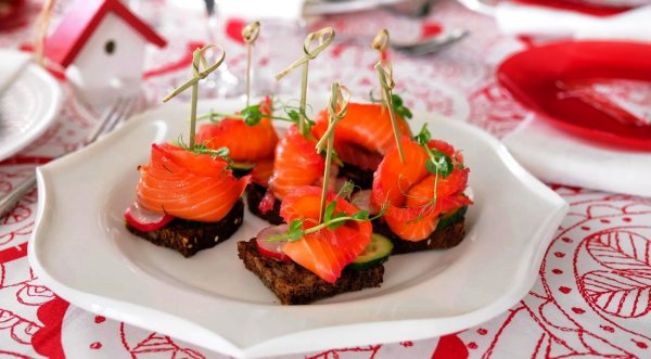 Канапе с красной рыбой, маринованной в хрене со свеклой