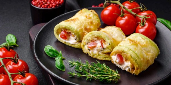 ✅ Рулетики из кабачков - с сырно-овощной начинкойЗаверните в нежные молодые кабачки начинку из крем-сыра, чеддера, помидоров и сладкого перца.