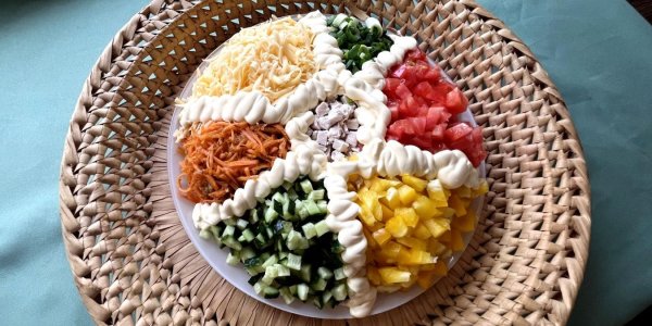 Описание: ✔ Салат «Калейдоскоп» - с курицейЕвропейская кухня / СалатДля приготовления блюда понадобятся простейшие ингредиенты. Благодаря красивой подаче оно подойдёт даже для праздничного стола.Для 8 порций нужно... ◆ Отварное куриное филе - 1 штука◆ Свежие огурцы - 2 штуки◆ Крупный помидор - 1 штука◆ Болгарский перец - 1 штука◆ Зелёный лук - 50 г◆ Сыр - 110 г◆ Морковь по-корейски - 120 г◆ Майонез - 110 гГотовка: 20 мин.➤ Подготовьте ингредиенты. Овощи и зелень помойте и обсушите.➤ Нарежьте отварное куриное филе мелкими кубиками. При желании можно заменить его копчёной грудкой или другим мясом по вкусу.➤ Нарежьте овощи мелкими кубиками.➤ Измельчите лук.➤ Натрите сыр на крупной тёрке.➤ Соберите салат на большом круглом блюде. В центр положите курицу, а по краям — овощи, лук, корейскую морковь и сыр.➤ Переложите майонез в кондитерский мешок или плотный полиэтиленовый пакет. Равномерно распределите соус по границам секций.© Из Сети. Автор - Виктория Курачёва