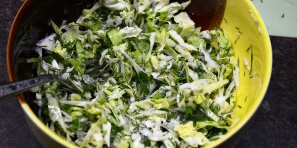 Описание: ▶ Хрустящий салат - с молодой капустой ◀Европейская кухня / СалатЭтот сочный ароматный салат станет отличным дополнением к шашлыкам.Для 4 порций нужно... ◆ Молодая капуста - 450 г◆ Соль - по вкусу◆ Свежие огурцы - 3 штуки◆ Зелёный лук - 50 г◆ Укроп - 20 г◆ Растительное масло - 3 ст. ложкиГотовка: 25 мин.✔ Нашинкуйте капусту. Посолите и разомните руками, оставьте на 10 минут.✔ Огурцы нарежьте небольшими кусочками. Зелёный лук и укроп нарубите.✔ Добавьте подготовленные ингредиенты к капусте вместе с маслом, перемешайте.© Из Сети. Автор - Ирина Сахарова