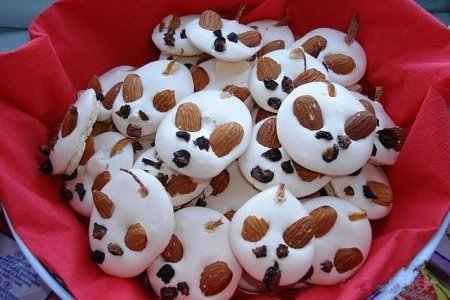 Описание: ИнгредиентыСахар - 1 стакан.Яичные белки - 2 шт.Миндаль - 50 г.Изюм - 30 г.Цедра лимона.Способ приготовленияШаг 1 Взбить яичные белки с сахаром в густую пену.Шаг 2 Застелить противень пекарской бумагой и столовой ложкой аккуратно выложить безе.Шаг 3 Выпекать безе при t 90-110 градусов.Шаг 4 Украсить безе - ушки мвшек из половинок миндальных орехов, глаза и нос - из кусочков изюма, хвостики из цедры лимона.Приятного аппетита!