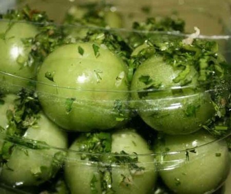 Описание: Зеленые помидоры по-грузинскиИнгредиенты для рецептапомидоры - один килограммзелень сельдерея - 200 граммзелень петрушки - 150 граммзелень укропа - 100 граммчеснок - 50 граммвода - 3 стаканалавровый лист - по одна штука. на банкуперец красный слабожгучий - одна штука.соль - одна столовая ложкаСпособ приготовления рецепта1. Твердые не очень крупные помидоры проколем в холодной воде, дадим воде стечь.2. Зубчики чеснока разрежем на 4 части. Стручок перца разрежем вдоль и, удалив семена, нарежем полукольцами.3. В кастрюлю вольем воду, дольем ее до кипения, положим пучки сельдерея и петрушки, проварите 35 минут, после чегозелень вынем и охладим. В отвар добавим соль.4. В чистые, ошпаренные банки уложим плотными рядами помидоры, заполняя промежутки веточками сельдерея, петрушки и укропа, а также кусочками чеснока и перца. Доверху наполненные банки зальем теплым рассолом, укупорьте и поставим в сухое прохладное место.5. Помидоры будут готовы примерно через 2 недели.