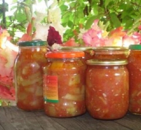 Описание: Огурчики на зиму БЫСТРО И ПРОСТО!!!Ингредиенты:5 кг огурцов2 кг помидор0,5 кг болгарского перца1 стакан сахара2 ст.ложки соли1 стакан рост.масла1-2 ч.ложки уксусной эссенцииКак приготовить:За неделю мои огурцы переросли, выбрасывать было жалко, порывшись в своих записях и многочисленных журналах я нашла очень интересный рецепт именно для таких переростков.Итак. Берем огурцы-переростки, очищаем от грубой кожицы, нарезаем произвольными кубиками, можно убрать крупные семечки. Помидоры и перцы пропускаем на мясорубку (я измельчила в блендере), в кастрюльку сложить все кроме уксуса и варить после закипания 4 минуты (не больше!), добавить уксус и еще 1 минуту кипятим. Горячим закладываем в подготовленные банки и быстро закатываем. Достаточно быстро и просто.