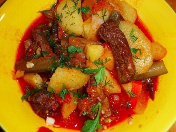 Описание: Азу по-татарскиИнгредиенты:Мясо — 150-150 гМасло топленое – 15 гТомат-пюре – 15 гОгурцы соленые 50 гКартофель – 150 гЛук – 35 гСольПерецЧеснокПриготовление:1. Режем мясо кусочками примерно 2х4 см.2. Соответственно лук, картофель и огурцы стараемся тоже нарезать брусочками, картофель покрупнее, морковь и огурцы помельче. 3. Лук режем примерно четверть-кольцами.4. Картофель заливаем водой и отставляем в сторону.5. И обжариваем, помешивая в масле, наше мясо. Но не все сразу, а погружаем по нескольку кусочков. Тогда они быстро обжариваются со всех сторон, покрывается корочкой и не теряет сок.6. Мясо укладываем в кастрюлю, сверху нарезанный лук и помидоры, долить бульона или воды, что бы почти покрыло все овощи, и ставим тушить на медленном огне. Тушить будем минут 35-40.7. Тем временем отвариваем в небольшом количестве воды нарезанные огурцы.8. Приступаем к обжариванию картофеля до полуготовности, предварительно слив воду и тоже, можно обсушить его на полотенце. Обжариваем, используя тот же вок.9. Как подошло время, закладываем картофель и огурцы в кастрюлю, добавляем соль, если надо – перец и тушим до готовности картофеля, обычно не больше 10 минут. Примерно 5-7.10. Режем зелень и измельчаем чеснок!