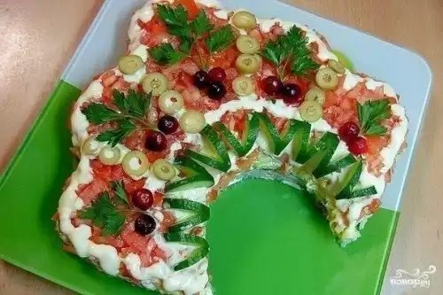 Описание: Салат "Русская красавица" Ингредиенты:-Картофель 500 Грамм-Ветчина 350 Грамм-Огурец свежий 200 Грамм-Яйца 4 Штуки-Куриное филе 300 Грамм-Сыр 300 Грамм-Помидоры 350 Грамм-Майонез 350 Грамм-Соль, перец - По вкусу1. Подготовим все ингредиенты. Картофель отварим до готовности, натрем на крупной терке. Ветчину нарежем небольшими кубиками или ломтиками. Огурец нарежем тонкими ломтиками. Яйца отварим вкрутую и натрем на крупной терке. Куриное филе отварим до готовности и разберем на волокна. Сыр натрем на крупной терке. Помидоры нарежем небольшими кубиками. Солим, перчим ингредиенты по вкусу.2. Берем подходящую форму для салата (у меня есть специальная форма для этого салата, в виде кокошника, однако вы можете использовать любую другую).3. Выкладываем слоями картофель, ветчину, огурец, яйца, куриное филе, сыр и помидоры. Каждый слой не забываем промазывать майонезом.4. Остается только украсить салат любыми подходящими для этого ингредиентами - зеленью, оливками, огурцами, красной рыбкой и т.д.5. Даем салату постоять пару часов в холодильнике - и подаем к столу.