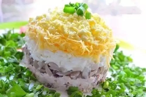 Описание: Салат 'Ночь'. Ингредиенты:Яйца вареные 5 штгрудка куриная копченая 200гргрибы маринованные 200грсыр 100-150грзелень для украшениямайонез или сметана.Приготовление:Отделить белки от желтков. По отдельности натереть. Мясо и грибы мелко порезать. Сыр натереть на мелкой терке. Мясо заправить майонезом. Выкладываем слоями снизу вверх: мясо, грибы, майонез, белки, майонез, сыр, майонез. желтки. украсить зеленью..