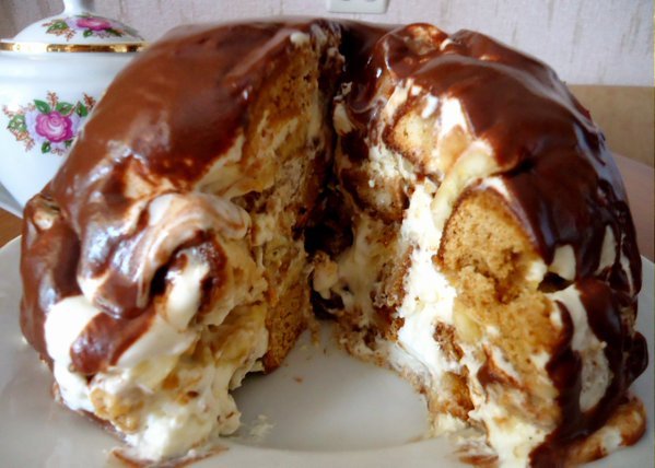 Описание: ТОРТ ИЗ ПРЯНИКОВИНГРЕДИЕНТЫ:● 500 граммов сметаны● 100 граммов сахарнойпудры● два спелых банана,● один стакан грецкихорехов.ПРИГОТОВЛЕНИЕ:Этот тортик весьма удобентем, что готовится он легко,просто и на удивлениебыстро, ведь, в отличие отболее традиционныхвариантов таких сладостей,для его приготовленияникаких коржей выпекатьне нужно - такой тортготовится из пряников,которые уже готовымиможно купить в любоммагазине, а промазываютсяпряничные слои кремом изсметаны.Для того, чтобыприготовить вкусненькийторт по предлагаемомурецепту, вам будут нужнытакие продукты: половинакилограмма пряников(самых обыкновенных инедорогих), 500 граммовсметаны (достаточножирной и густой), 100граммов сахарной пудры,два спелых банана, а такжеодин стакан очищенных отскорлупы грецких орехов.Грецкие орехи необходимослегка обжарить нараскаленной сухойсковородке, а после этогомелко нарубить их.Пряники следует нарезатьна пластинки толщинойпримерно три-четыремиллиметра, бананыочистить от кожуры ипорезать еще болеетонкими, по сравнению спряниками, кружочками.Сметану смешать с сахарнойпудрой и слегка взбить дообразования густогооднородного крема.Подходящую посудину(глубокую миску иликастрюльку) нужнозастелить пищевойпленкой и затемвыкладывать в нее слоямищедро смоченные всметанном креме пряники икружочки бананов, приэтом каждый слойпосыпаетсяизмельченными орехами.Сверху тортик надо такжеприкрыть пленкой,аккуратно утрамбоватьруками и убрать вхолодильник на 10-12часов. Готовыйохлажденный торт нужновыложить на плоскоеблюдо, убрать пленку иподавать к столу.Пожеланию можно ужеготовый торт политьшоколадной глазурью. Аможно просто сверхупосыпать ореховойкрошкой или тертымшоколадом.
