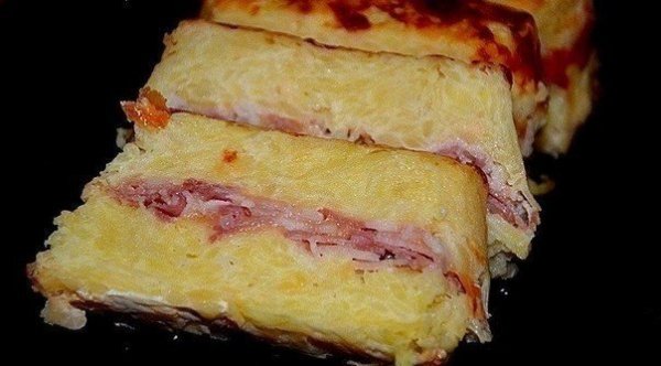Описание: Ингредиенты:- 7 крупных картофелин- 1 яйцо- 2 ст. ложки сметаны- 200 г бекона- 100-120 г твердого сыра- 1 луковица- соль по вкусу1. Чистим картофель и варим его до полуготовности. Солим по вкусу.2. Бекон режем небольшими кусочками. Лук мелко шинкуем.3. Слегка обжариваем лук и бекон, минуты 3-4.4. Сыр натираем на крупной терке.5. Картофель остужаем, натираем на крупной терке.6. Смешиваем картофель, яйцо, сметану и треть сыра.7. Форму для запекания смазываем маслом.8. Выкладываем половину картофельной массы.9. На нее кладем слой бекона с луком, смешанные с оставшимся сыром.10. Выкладываем второй слой картофеля.11. И ставим в духовку.Выпекаем при 180 градусах около 40 минут. Края запеканки должны подрумяниться.Режем на порционные кусочки и сразу подаем!