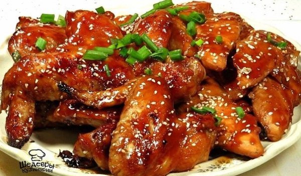 Описание: ИНГРЕДИЕНТЫ:для крылышек: 2 ст л растительного масла 800 гр куриных крылышек 3 зубчика раздавленного чеснока соль,перец по вкусудля соуса: 5 ст л сливочного масла 2 ст л меда 2 ст л острого томатного соуса 1 ст л соевого соуса 2 ч л лимонного сокаПРИГОТОВЛЕНИЕ:Духовку разогреть. Крылышки обсушить полотенцем. В миске смешать растительное масло,чеснок,соль и перец,выложить туда же крылышки,перемешать.Выложить крылышки на один слой на противень,и запекать в течении 40-50 минут до готовности.В это время сделать соус:растопить в кастрюле сливочное масло,добавить томатный соус,соевый соус,мед и сок лимона,довести почти до кипения,убрать с огня. Готовые крылышки выложить в миску,полить горячим соусом и аккуратно перемешать. Очень вкусные,горячие,ароматные крылышки-вкуснятина.
