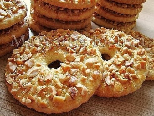 Описание: Песочные кольца с орехамиТесто: 250 г сливоч. масла (холодного) - порезать кусочками 150 г сахара 1 яйцo (среднее) 1 п. ванил. сахара (8 г) 1 ч. л. с горкой разрыхлителя (5 г) 2,5 ст. муки (400 г) - просеять Дополнительно: 1 ст. жареного арахиса (160 г) - порубить не мелко ножом Для смазывания: 1 желток + 2 ст. л. молока - перемешать вилочкой В чашку выкладываем масло, сахар, яйцо, ванил. сахар и разрыхлитель - слегка перемешиваем.Постепенно подсыпая муку, замешиваем песочное тесто (оно будет мягкое и не будет липнуть к столу и рукам). Чашку с тестом накрываем крышкой и ставим в холодильник на 30 минут.Затем тесто совсем слегка вымешиваем и раскатываем в пласт толщиной 8 мм, припыляя стол мукой. Вырезаем формочкой большие кругляшки (у меня размером 9,5 см).Затем в центре больших кругляшек подручными средствами вырезаем маленький кружок (я воспользовалась прибором для удаления сердцевины в яблоках, у меня диаметром 2 см). Обрезки теста собираем и снова раскатываем в пласт.Далее берём одну заготовку, смазываем всю её поверхность желтковой смесью и окунаем смазанной стороной в орехи, слегка прижимаем сверху пальчиками, чтобы орешки прилипли. * мне так не очень удобно было делать, поэтому я просто укладывала кругляшку на ладонь, смазывала её яичной смесью и обсыпала орешками на весу, после слегка их придавив пальчиками Перекладываем полученное колечко на противень, застеленный бумагой для выпечки. орешками вверх. С остальными кругляшками поступить точно так же. Выпекать колечки в разогретой духовке при t-180°С, 15 минут, до румяности. Приятного аппетита!