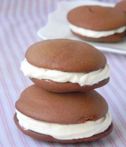 Описание: Вкуснющее пирожное Вупи на радость всем сладкоежкам!Это традиционные американские пирожные. Готовятся они очень быстро и влюбляешься в них с первого укуса. Мягкие шоколадные бисквиты в сочетании со взбитыми сливками это просто БОМБА. Ингредиенты:Тесто: Яйцо куриное 1 шт. Масло сливочное 80 г Сахарная пудра 100 г Какао-порошок 3 ст. л. Молоко 100 мл Мука пшеничная 130 г Разрыхлитель 1 ч. л. Ванилин 1 г Крем: Сливки 35% 150 мл Сахарная пудра 4 ст. л.Приготовление:1. Масло достать из холодильника заранее. 2. Отмерить нужное количество сахарной пудры и молока. 3. В миске смешать какао, муку, разрыхлитель и ванилин.4. Масло растереть с сахарной пудрой до мягкого пышного состояния.5. Вбить яйцо, тщательно перемешать.6. Частями вмешать сухие ингредиенты (муку, какао) и молоко.7. Размешать до однородного состояния.8. С помощью ложки или кондитерского мешка выложить тесто на противень в форме небольших круглых лепешек они увеличатся в размере при выпекании.9. Выпекать в разогретом духовом шкафу при температуре 180C 10-12 минут. Пока бисквиты остывают, приготовить крем. 10. Взбить сливки с сахарной пудрой до устойчивых пиков.11. Выложить крем на одну лепешку, накрыть другой. Можно слегка присыпать пирожные сахарной пудрой.