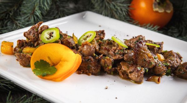 Описание: 600 г куриной печени150 г хурмы150 г репчатого лука60 г топленого масла50 г белого сухого вина20 г подсолнечного масласоль по вкусуперец по вкусуПечень очистите от прожилок и нарежьте небольшими кусками. Муку смешайте с солью и перцем. Обваляйте печень.Обжарьте на раскаленной сковороде на смеси подсолнечного и топленого масла репчатый лук до золотистого цвета, добавьте печень.Обжарьте все очень быстро, буквально минуты три, затем добавьте вино. Как только вино выпарится, добавьте крупно нарезанную хурму, прогрейте 2-3 мин. Перед подачей украсьте кинзой.