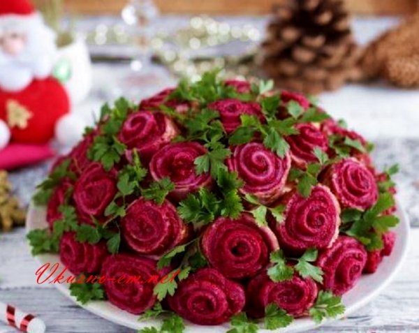 Описание: Основа:Филе одной селедки2 картофелины2 моркови2 яйца1 луковицаМайонезДля блинов:3 столовые ложки растительного масла2 яйцаПо 1 чайной ложки сахара, соли и соды0,5 стакана молока0,5 стакана кефира1 стакан мукиНачинка для блинов:2-3 свеклы2 зубчика чеснокаПучок петрушки для украшенияПриступаем к приготовлению. Отвариваем овощи для основы салата, буряк и 2 яйца, очищаем от кожуры и скорлупы.Затем приступаем к приготовлению блинов. Все ингредиенты для блинов смешиваем и взбиваем на небольшой скорости блендером, пока не будет комочков из муки. Тесто для блинов оставляем на 10-15 минут. Потом печем блины, примерно 3 мм толщины и даем им остыть.Пока блинчики остывают, приступаем к приготовлению основы. Картофель, морковь, яйца натираем в отдельные мисочки на мелкой терке. Сельдь чистим, убираем косточки и нарезаем на филейные полоски. Лук нарезаем кольцами или полукольцами.1слой кусочки селедки и лук2 слой картофель укладываем горкой3 слой морковь4слой куриные яйцаКаждый слой смазать майонезом. основа для салата готова.Чеснок со свеклой натираем на мелкой терке, добавляем немного майонеза и перемешиваем.Смазываем каждый блинчик свекольной массой и сворачиваем рулетом.Нарезаем толщиной 2 см. Затем маленькие рулетики красиво выкладываем на основу для салата,пустые места заполняем петрушкой