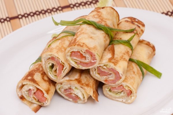 Описание: Как известно, тонкие блинчики хороши с разнообразными начинками. Блины с семгой и творожным сыром - один из способов приготовить закуску или вкусный, оригинальный завтрак. Готовится такое блюдо просто и быстро, из доступных продуктов, а результат получается превосходным. Для приготовления блинов с семгой и сыром понадобится: 7-8 тонких блинчиков; 200 г творожного сыра с зеленью; 200 г малосольной семги или другой рыбы; 2 свежих огурца. Приготовить тонкие блины по своему любимому рецепту. Я приготовила блины на молоке (но не использовала ванильный сахар, как в оригинальном рецепте), диаметр сковороды 20 см. Семгу использовала своего приготовления по этому рецепту. Огурец очистить от кожуры и нарезать соломкой. На блин намазать творожный сыр тонким слоем. Выложить полоски огурцов и кусочки семги. Свернуть блин рулетом. Таким образом приготовить все блинчики. Для подачи разрезать блины на кусочки. Аппетитные, вкусные блины с семгой и творожным сыром готовы.