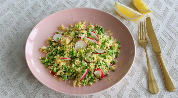 Описание: 200 г пшена3-4 пера зеленого лука10-12 редисок100 г свежего или замороженного зеленого горошка1 большой пучок укропа60 г сыра фетасоль по вкусуДля заправки:3 ст.л. оливкового масла3 ст.л. лимонного сока1 ч.л. лимонной цедрысоль и черный молотый перец по вкусуСмешайте ингредиенты заправки, приправьте солью и перцем.Промойте пшено до чистой воды в дуршлаге с мелкими ячейками, стряхните воду.Вскипятите 500 мл воды, посолите и всыпьте пшено. Убавьте огонь до слабого, закройте кастрюлю крышкой и готовьте 15 минут. Вода впитается, крупа станет мягкой, но не разварится. Начните проверять готовность крупы на несколько минут раньше. Как только вся вода впитается, снимите кастрюлю с плиты, разрыхлите крупу вилкой и оставьте под крышкой на 5 минут. Затем разрыхлите вилкой еще раз и остудите.Пока готовится крупа, нарежьте мелко укроп, по диагонали - зеленый лук, тонкими кружками – редис. Зеленый горошек залейте кипятком и оставьте на 5 минут, затем слейте воду.Смешайте все ингредиенты салата, полейте заправкой, перемешайте. Переложите в салатник и посыпьте раскрошенной фетой.
